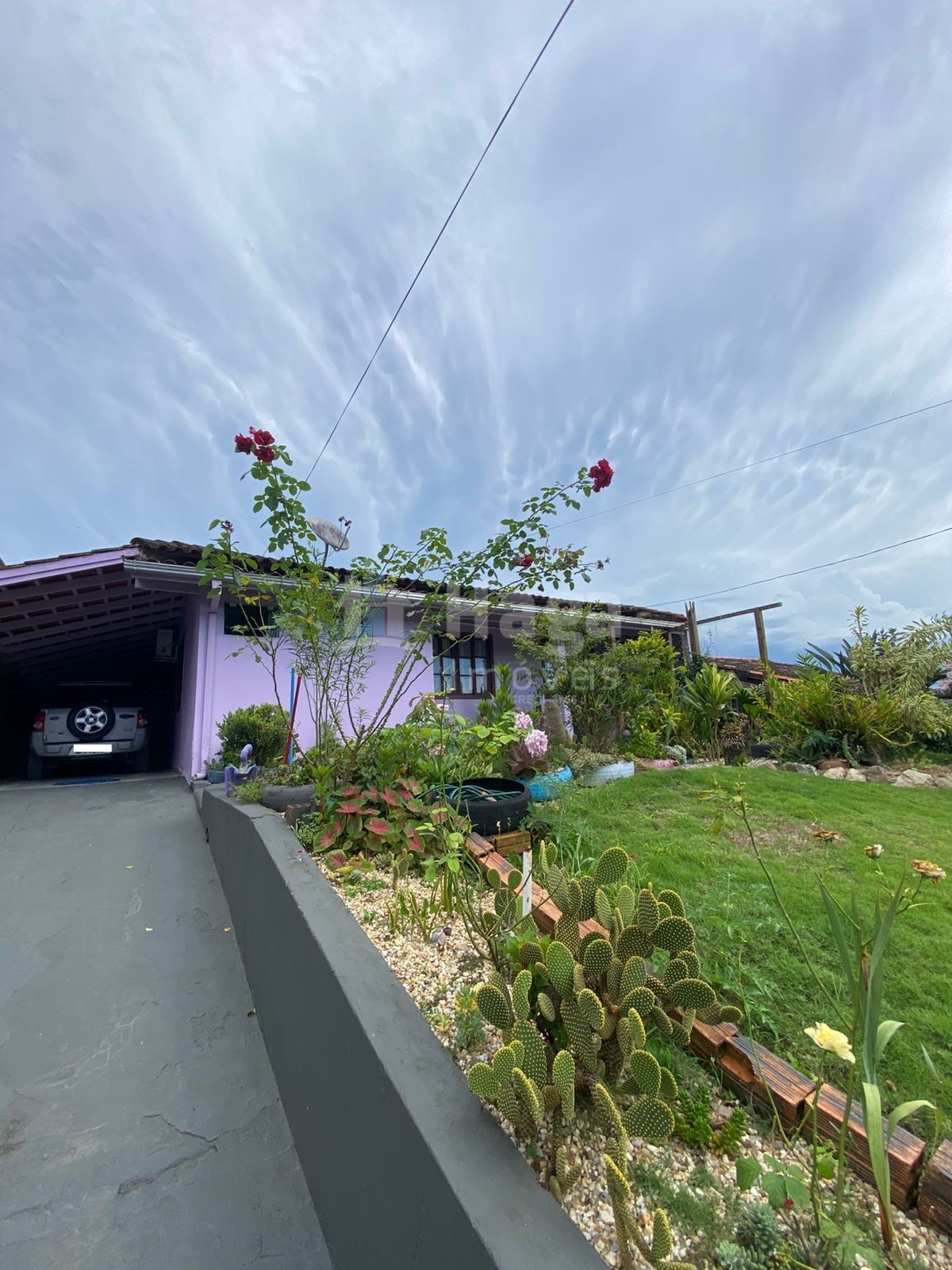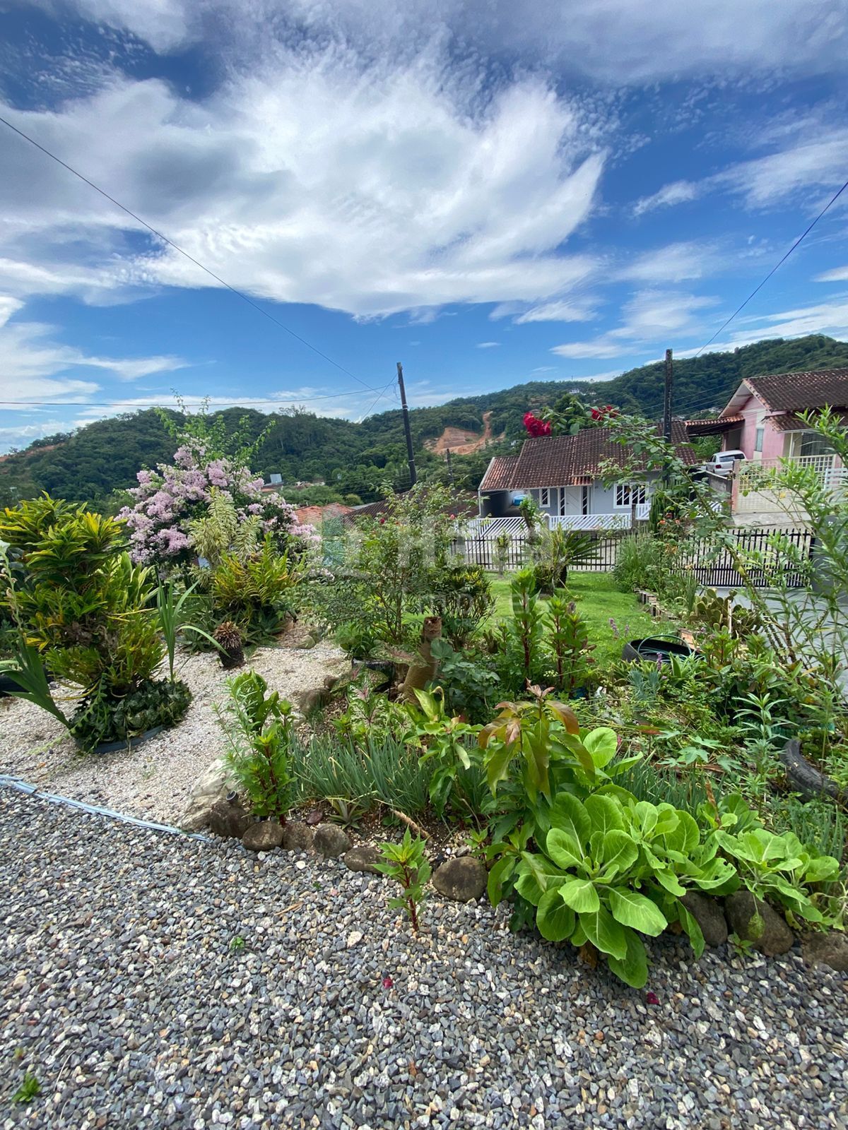 Jardim na frente da casa, criando um ambiente acolhedor e agradável