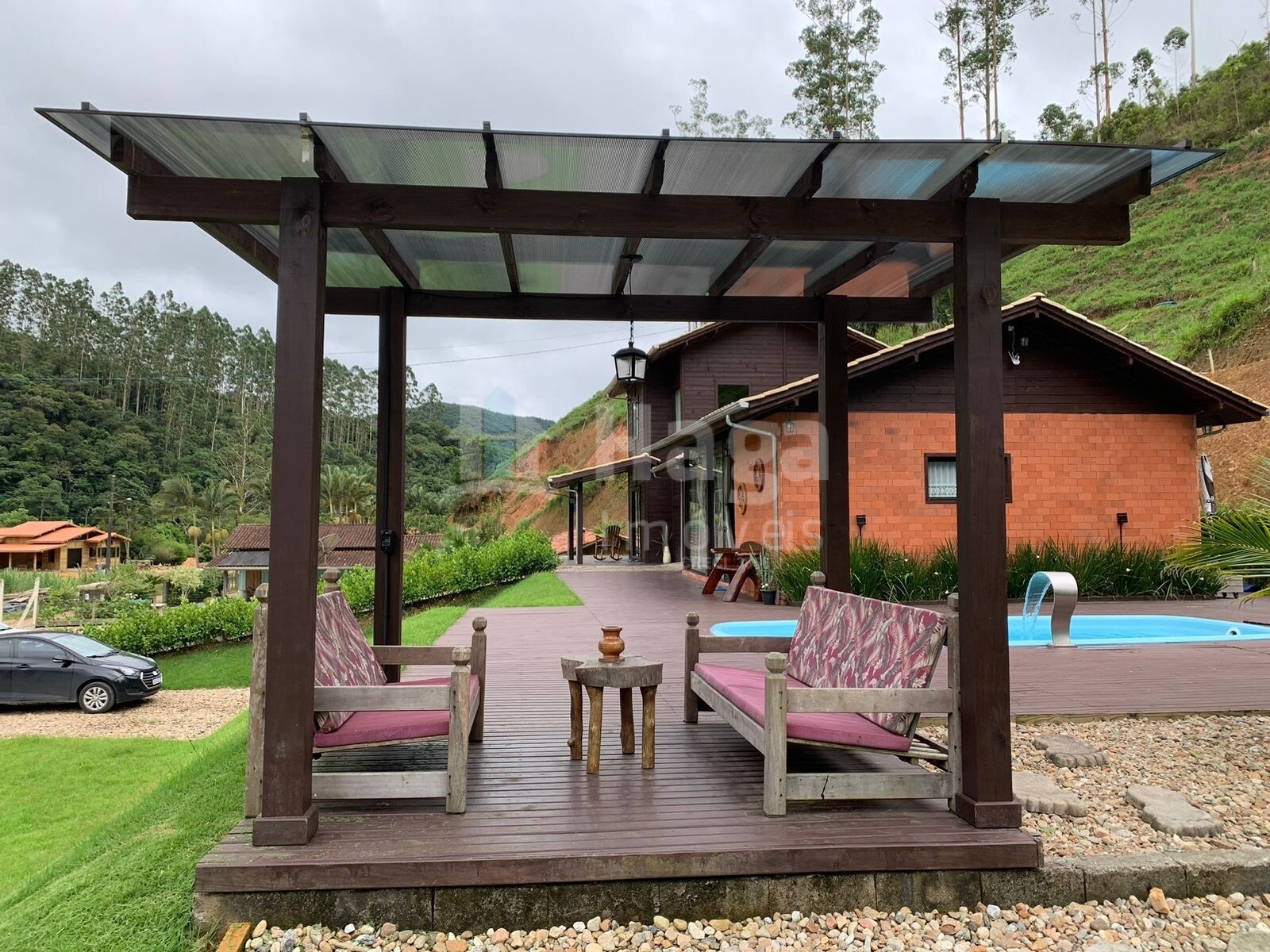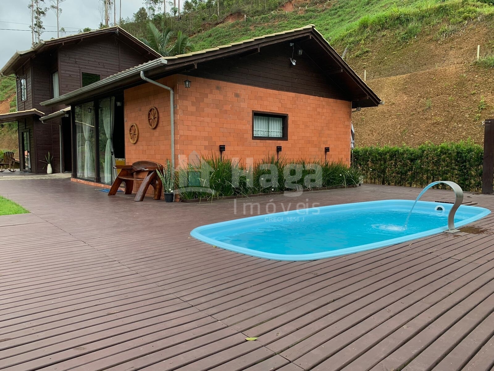Deck de madeira com uma piscina aquecida